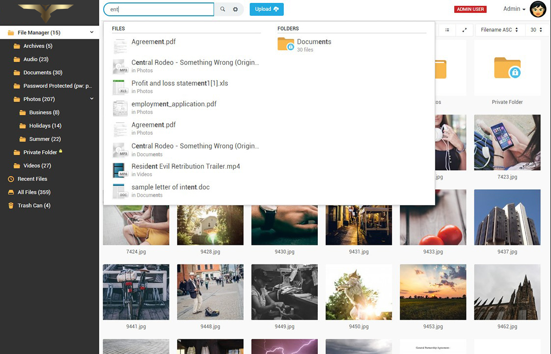 • Advanced search to find files by upload date and folder.